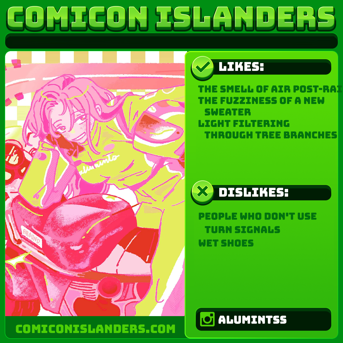 Alumints is a Chinese-American illustrator who strives to create dynamic drawings and merchandise exploring character interactions with whimsical colors.